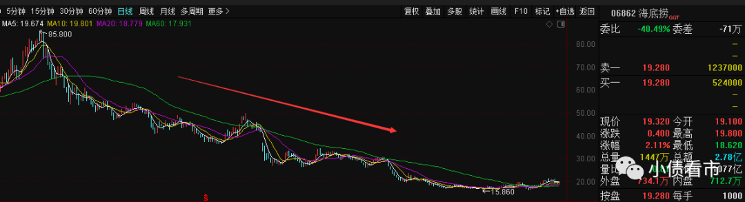 隨著口碑下降,海底撈的股價也開始跌跌不休,由2021年初的85.8港元高位一路下跌至19港元附近,市值縮水近八成,蒸發約3700億港元。