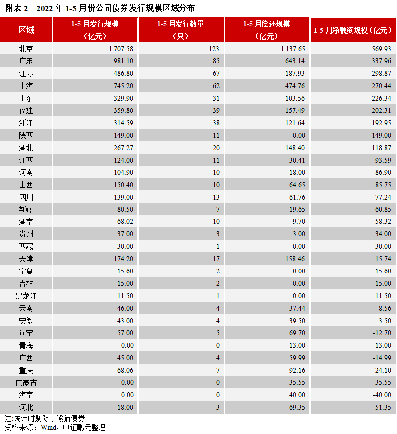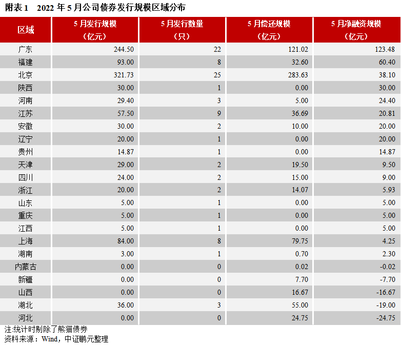 區域分布方面,5月份公募公司債券主要集中于北京、廣東、福建等地,私募公司債券主要集中在江蘇、浙江、河南等地。