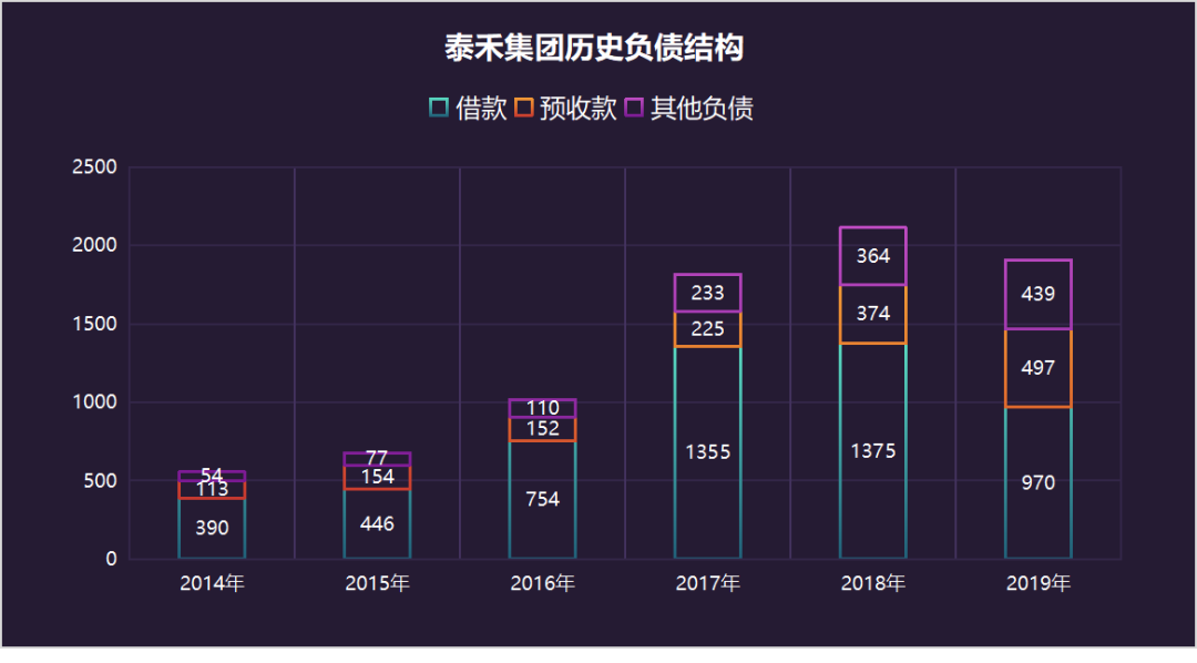 一直以來,泰禾都是依托于借款驅(qū)動,從2014年開始,借款占總負債比例一直維持在65%-75%之間。