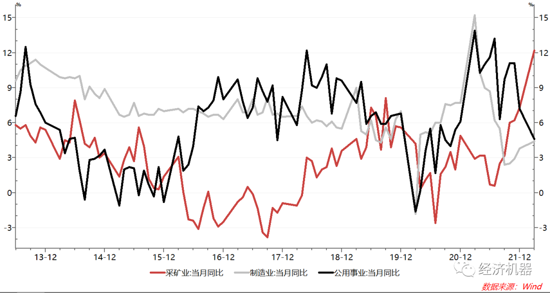 分行業看,采礦業持續高速增長。從行業看,3月,采礦業增加值當月同比增長12.2%,連續7個月加速,且顯著高于往年3%左右的平均增速。制造業當月同比增長4.4%,也呈現小幅加速跡象。公用事業同比同比增速則較上月出現較大下滑(圖3)。采礦業今年的高速增長與中央近來持續強調保障電力煤炭等能源穩定供應有關,也與近期大宗商品價格維持在高位密切相關、行業維持高景氣有關。