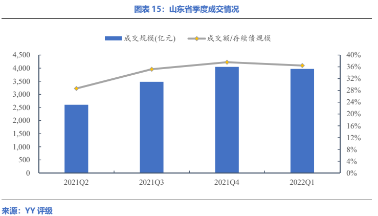 從各地市來看,青島市的成交金額依然遙遙領先,其次則是濟南、濟寧和濰坊。但從成交金額/存續債余額來看,濟寧和聊城成交更為活躍,成交金額占比均超過了45%,其余城市占比則在40%以下。