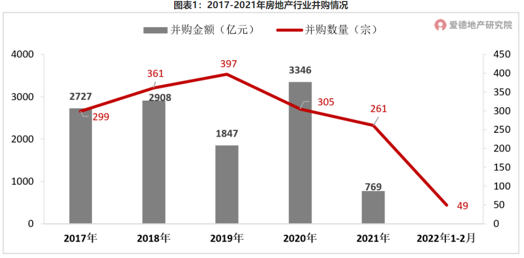 從數據上看,2021年房地產開發項目并購事件僅261起,交易規模僅769億,同比下降高達80%。
