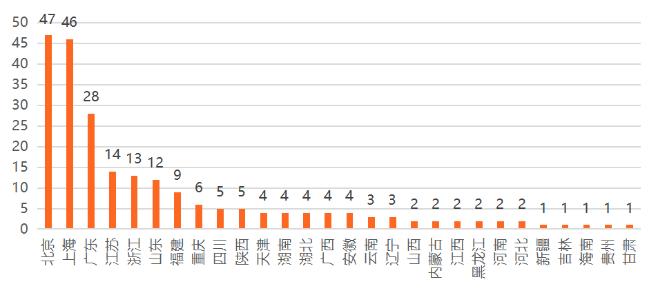 牌照業(yè)務(wù)范圍為全國的機構(gòu)有44家,廣東最多為12家,北京和上海各10家;牌照業(yè)務(wù)范圍僅為部分地區(qū)的有13家,上海5家,北京3家,廣東2家,海南、山東、四川各1家。