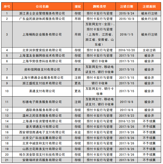 據(jù)央行官網(wǎng)公布數(shù)據(jù)顯示,目前已注銷牌照的機構(gòu)有39家,注銷原因中,被央行吊銷牌照的機構(gòu)有4家;因被合并而注銷牌照的有11家;被央行決定不予續(xù)展的有16家;主動申請注銷的有7家;未提交續(xù)展申請的1家。