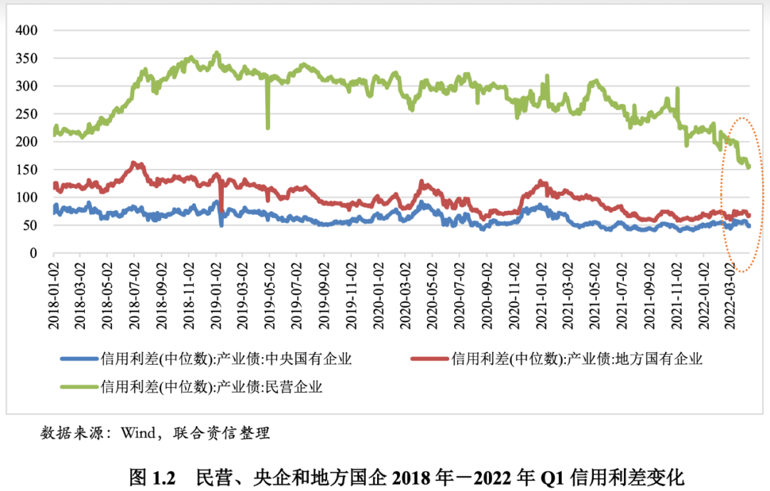 自2018年以來,民營(yíng)企業(yè)信用利差的變化以及其與國(guó)企信用利差的差值反映出其在外部融資環(huán)境收緊的情況下,所面臨的融資貴困境。自2018年宏觀“去杠桿”以來,疊加疫情爆發(fā)經(jīng)濟(jì)下行等因素,民企的信用利差,以及其與國(guó)企的信用利差差值一直處于高位。這說明外部融資環(huán)境收緊會(huì)導(dǎo)致民企融資成本上升,使民企融資貴的問題更為凸顯。2022年初,民企與國(guó)企的利差差值有所收窄,這或與今年出臺(tái)的一系列支持民企融資的政策有關(guān)。