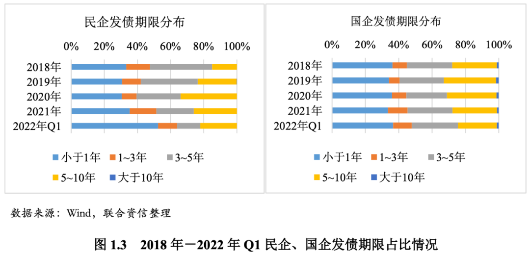 自2018年以來,民營(yíng)企業(yè)發(fā)債期限越來越短,2022年新發(fā)債券中1年期以下占比已超過一半,反映出民企在外部信用環(huán)境變差的情況下,所面臨的流動(dòng)性緊張困境。從發(fā)行期限的分布來看,民營(yíng)企業(yè)自2018年起新發(fā)債券中,中短期占比越來越高,1年以內(nèi)的新發(fā)債券占比已經(jīng)從2018年的33%增長(zhǎng)至2022年1季度的52%。與民營(yíng)企業(yè)相比,同期國(guó)有企業(yè)各年新發(fā)債券期限分布則較為均衡。民企發(fā)債期限越來越短,一方面表明民企流動(dòng)性較為緊張,需頻繁地借新還舊。另一方面也凸顯市場(chǎng)對(duì)投資民企信心不足,更趨謹(jǐn)慎。