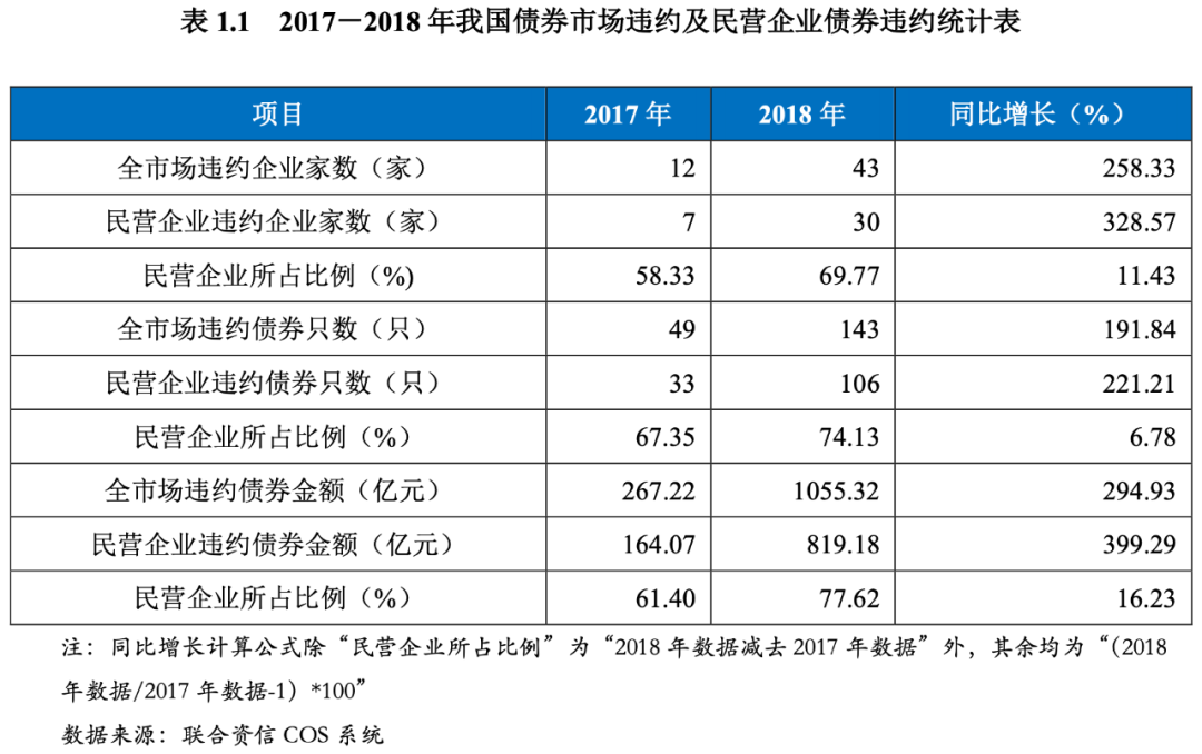 2018年外部融資環(huán)境收緊導(dǎo)致部分企業(yè)出現(xiàn)流動(dòng)性危機(jī),進(jìn)而引發(fā)了一波債券違約潮,當(dāng)年違約企業(yè)高達(dá)43家,同比增長(zhǎng)258.33%;違約債券達(dá)到143只,同比增長(zhǎng)191.84%;違約債券金額升至1055.32億元,同比增長(zhǎng)294.93%。民營(yíng)企業(yè)由于受到的流動(dòng)性沖擊最大,因此債券違約增長(zhǎng)高于整個(gè)市場(chǎng),且占據(jù)違約債券的大部分,在違約企業(yè)中占比約70%,違約債券只數(shù)和金額占比均超過70%,詳見下表。