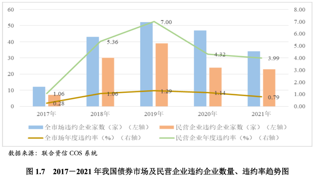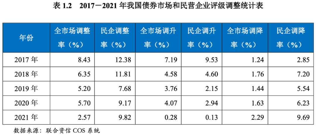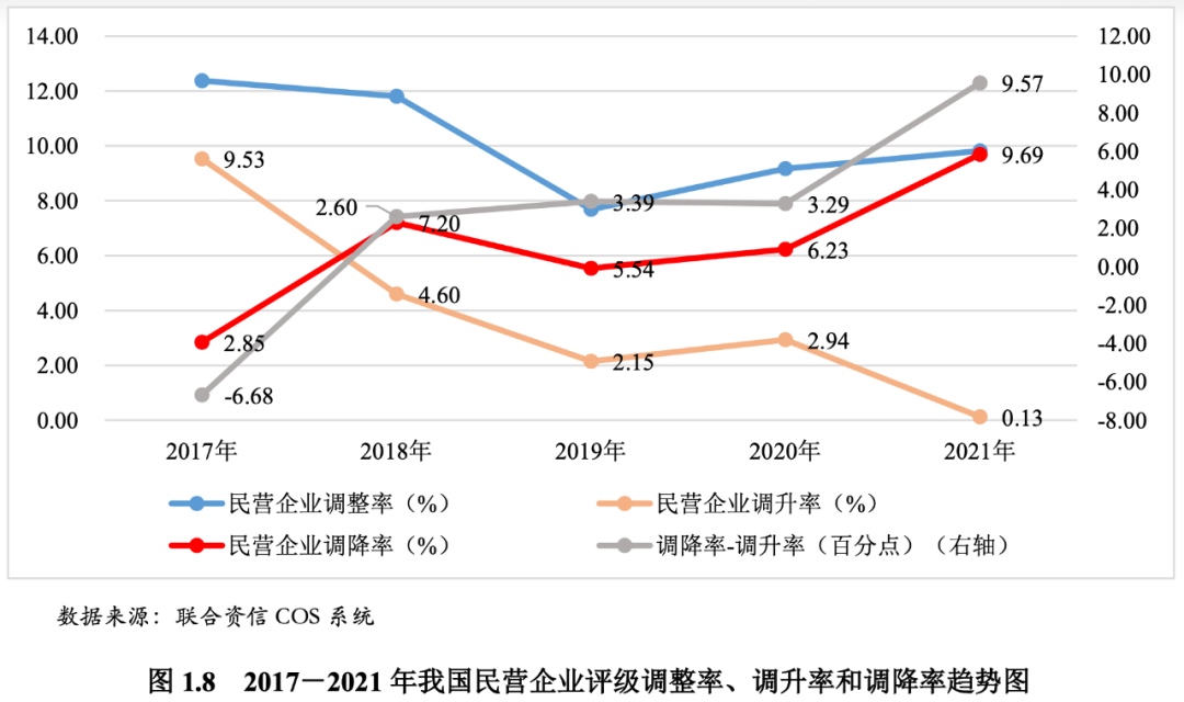 自2018年以來,民營(yíng)企業(yè)的信用評(píng)級(jí)變化反映出其整體信用能力不斷弱化,信用評(píng)級(jí)機(jī)構(gòu)通過評(píng)級(jí)調(diào)整對(duì)民營(yíng)企業(yè)的違約風(fēng)險(xiǎn)進(jìn)行了提示和預(yù)警。從評(píng)級(jí)調(diào)整看,2017-2021年間,民營(yíng)企業(yè)的評(píng)級(jí)調(diào)整率先降后升,評(píng)級(jí)調(diào)升率整體呈下行趨勢(shì),而評(píng)級(jí)調(diào)降率則整體呈上升趨勢(shì)。與整個(gè)債券市場(chǎng)相比,民營(yíng)企業(yè)的評(píng)級(jí)調(diào)整率明顯高于債券市場(chǎng)總體,評(píng)級(jí)調(diào)升率整體低于債券市場(chǎng)總體,評(píng)級(jí)調(diào)降率則顯著高于債券市場(chǎng)總體。2017年,民營(yíng)企業(yè)的評(píng)級(jí)調(diào)升率尚高于評(píng)級(jí)調(diào)降率6.68個(gè)百分點(diǎn),但自2018年發(fā)生逆轉(zhuǎn),其評(píng)級(jí)調(diào)降率顯著高于評(píng)級(jí)調(diào)升率,直至2021年評(píng)級(jí)調(diào)降率高于評(píng)級(jí)調(diào)升率9.57個(gè)百分點(diǎn),見圖1.8。