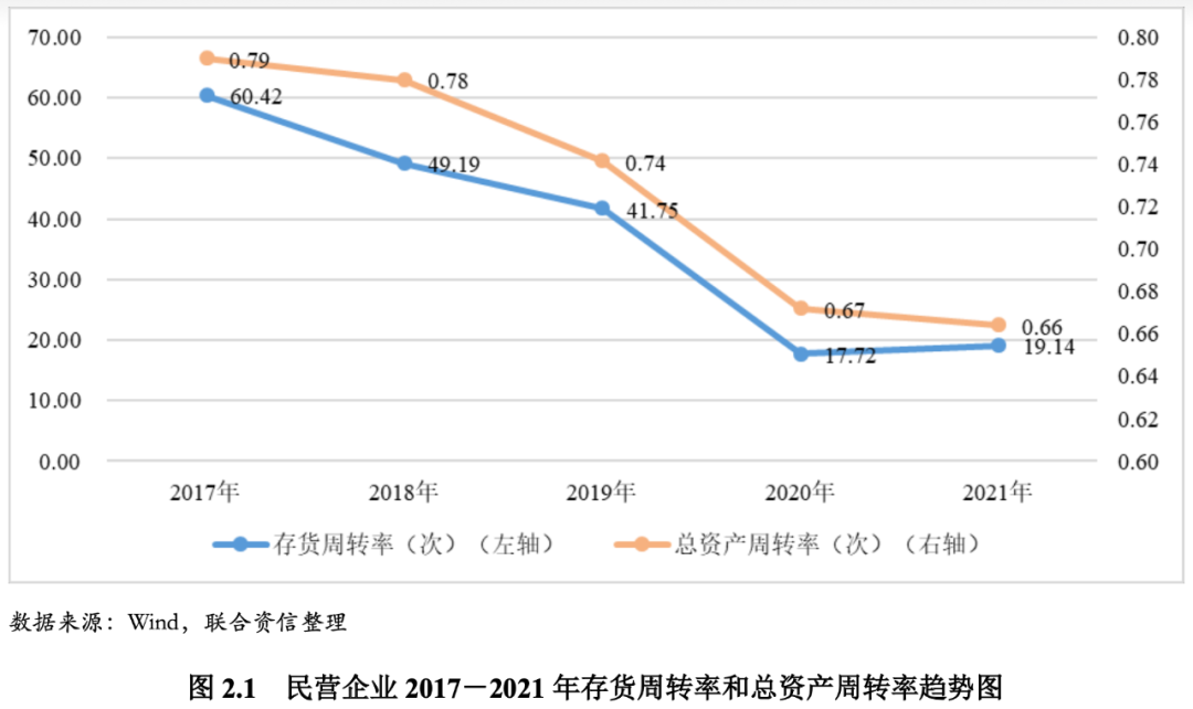 2018年以來,民營(yíng)企業(yè)的經(jīng)營(yíng)效率整體呈下行走勢(shì)。從樣本企業(yè)的存貨周轉(zhuǎn)率均值來看,2018-2020年同比分別下降11.23次、7.44次和24.03次,反映出民營(yíng)企業(yè)銷售不暢,存貨積壓較為嚴(yán)重。2021年我國(guó)經(jīng)濟(jì)從疫情中快速?gòu)?fù)蘇,民營(yíng)企業(yè)的存貨周轉(zhuǎn)率有所反彈,同比上升1.42次,但相比2017年仍處于底部區(qū)域。從樣本企業(yè)的總資產(chǎn)周轉(zhuǎn)率均值看,2018-2021年間呈持續(xù)下行趨勢(shì),其中2019年和2020年降幅較為明顯,分別下降0.04次和0.07次。總體來看,自2018年以來,在信用環(huán)境、新冠疫情、供應(yīng)鏈不暢和全球經(jīng)濟(jì)復(fù)蘇乏力等因素沖擊下,我國(guó)民營(yíng)企業(yè)的經(jīng)營(yíng)效率下降較為顯著,目前仍在底部區(qū)域徘徊。今年由于新冠疫情的散發(fā)和多發(fā),我國(guó)各地加強(qiáng)了封控和管控措施,部分民營(yíng)企業(yè)被迫停工停產(chǎn),經(jīng)營(yíng)效率可能進(jìn)一步下行。