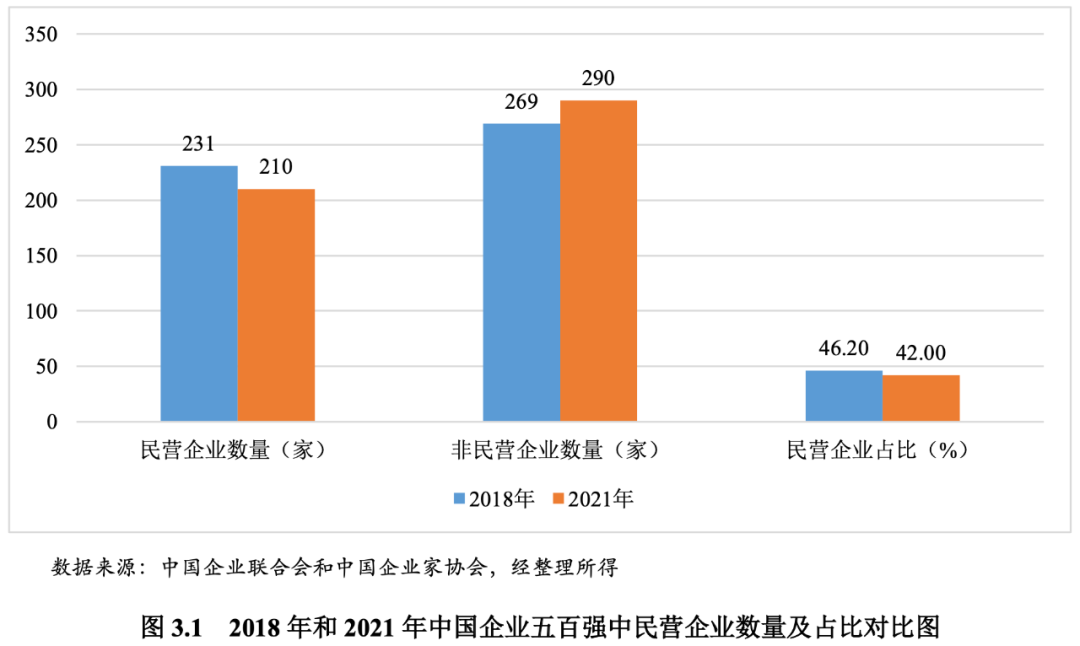 我們采用中國(guó)企業(yè)聯(lián)合會(huì)和中國(guó)企業(yè)家協(xié)會(huì)聯(lián)合發(fā)布的中國(guó)企業(yè)五百?gòu)?qiáng)名單,通過對(duì)比分析民營(yíng)企業(yè)2021年和2018年在五百?gòu)?qiáng)名單中的數(shù)量占比和排名變化來分析其整體市場(chǎng)競(jìng)爭(zhēng)力的變化。2018年,中國(guó)企業(yè)五百?gòu)?qiáng)名單中有231家民營(yíng)企業(yè),所占比例為46.20%;2021年,中國(guó)企業(yè)五百?gòu)?qiáng)名單中民營(yíng)企業(yè)為210家,減少21家,所占比例為42.00%,下降4.20個(gè)百分點(diǎn),由此可見民營(yíng)企業(yè)的整體市場(chǎng)競(jìng)爭(zhēng)地位有所下降。從排名看,與2018年相比較,2021年有87家民營(yíng)企業(yè)的排名上升,但有144家民營(yíng)企業(yè)排名下降,其中63家民營(yíng)企業(yè)退出了五百?gòu)?qiáng)名單,民營(yíng)企業(yè)的市場(chǎng)地位總體上出現(xiàn)明顯下降。在2018年中國(guó)企業(yè)五百?gòu)?qiáng)中,有36家企業(yè)發(fā)生債務(wù)違約,其中民營(yíng)企業(yè)28家,占比超過四分之三;發(fā)生債務(wù)違約的28家民營(yíng)企業(yè),有18家退出五百?gòu)?qiáng)名單,7家排名下降,僅3家排名上升,可見債務(wù)危機(jī)是導(dǎo)致民營(yíng)企業(yè)市場(chǎng)地位下降的重要原因之一。