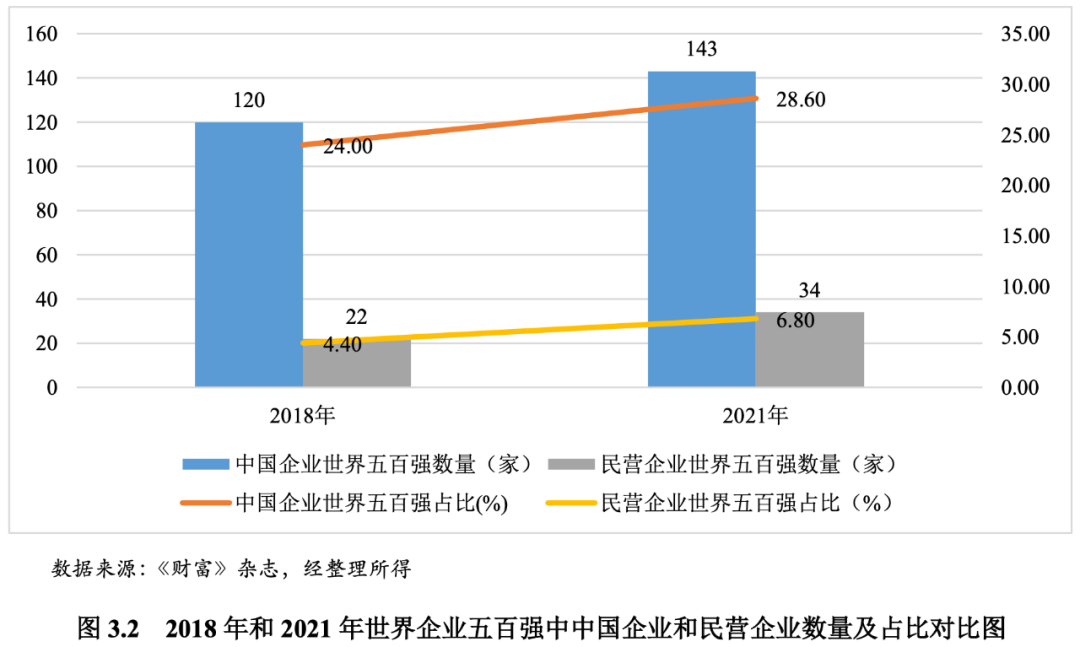 根據(jù)《財(cái)富》雜志的世界五百?gòu)?qiáng)排名,2021年有143家中國(guó)企業(yè)入圍,比2018年增加23家,所占比例為28.60%,比2018年提高4.60個(gè)百分點(diǎn),其中民營(yíng)企業(yè)為34家,比2018年增加12家,所占比例為6.80%,比2018年提高2.40個(gè)百分點(diǎn)。由此可見,中國(guó)企業(yè)在全球經(jīng)濟(jì)中的競(jìng)爭(zhēng)地位顯著提升,民營(yíng)企業(yè)在全球經(jīng)濟(jì)中的競(jìng)爭(zhēng)地位也有所上升。