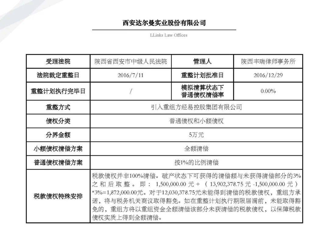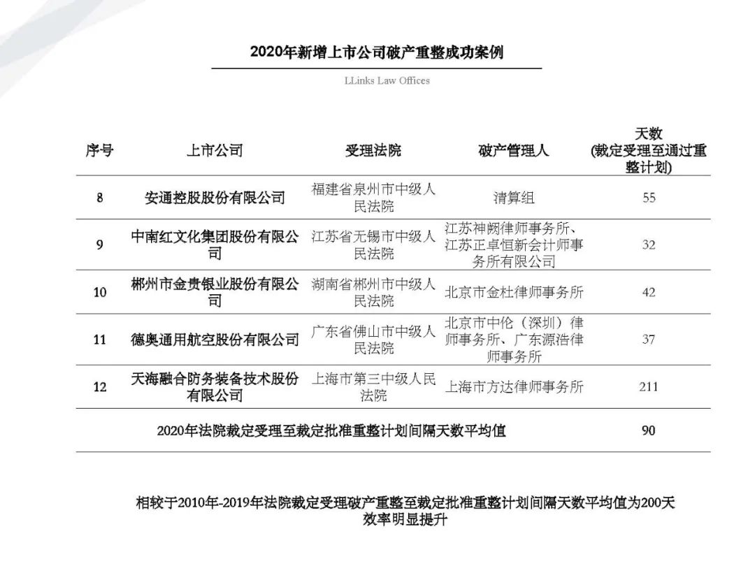 通過比較該等案例與此前的69個重整案例, 我們發現, 與目前破產領域“ 能破則破, 應破盡破 ”的指導原則相對應的是, 破產受理法院與破產管理人的專業水平與案件處理效率與此前相比都有了巨大飛躍, 不少上市公司通過執行重整計劃獲得了真正的新生, 《企業破產法》不再是被“束之高閣”的“國企改革法”, 而是真正成為了企業重獲新生的捷徑。今天我們特與大家分享該81個破產重整案例, 希望大家可以有所收獲。