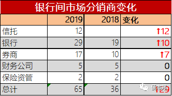 從數(shù)量上來看,2019年具有參團(tuán)分銷資格的市場(chǎng)成員,從2018年初的36家快速上升到65家,其中信托公司和銀行成為新增主力,分別達(dá)到12家和10家。背后其實(shí)體現(xiàn)的就是微觀經(jīng)濟(jì)學(xué)的樸素原理——行業(yè)出現(xiàn)超額利潤(rùn)會(huì)吸引更多的競(jìng)爭(zhēng)者進(jìn)入,最終會(huì)降低行業(yè)的整體利潤(rùn)水平。