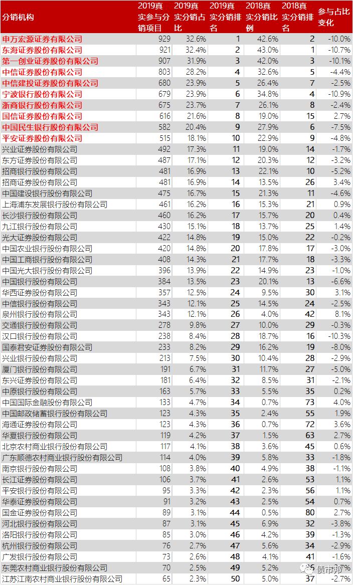 同樣按照去除主承項(xiàng)目之后參與的分銷項(xiàng)目個(gè)數(shù)作為真實(shí)參與分銷項(xiàng)目情況,與2018年全年情況對(duì)比如下表所示:
