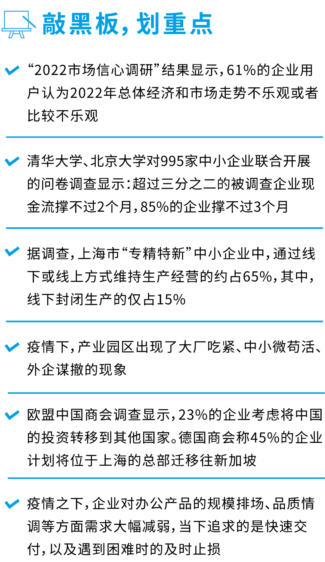 根據上海市經信委主任在新聞發布會上公布的數據,上海全市9000多家規模以上工業企業中,已復工4400多家,占比接近50%。但中小企業復工復產率還偏低,餐飲、文娛及維修、檢測、物流等生產性服務領域受疫情影響很大。據調查,全市“專精特新”中小企業中,通過線下或線上方式維持生產經營的約占65%,其中,線下封閉生產的僅占15%。