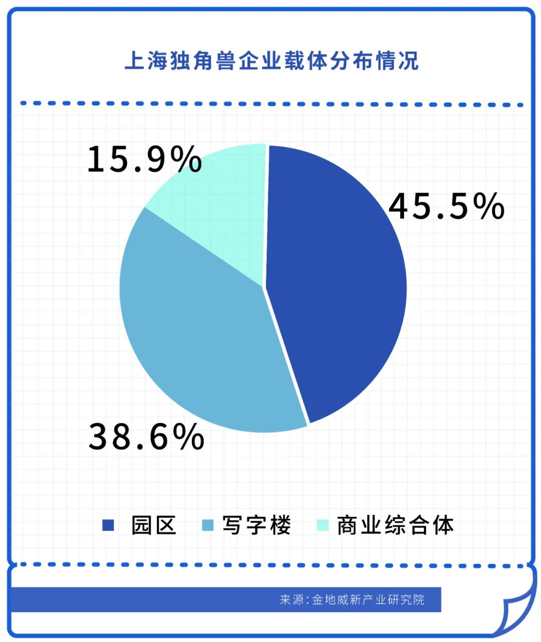 同時,產業園區也是科技創新型企業聚集地。上海45.5%的獨角獸企業、58.3%的潛在獨角獸企業的“落腳點”選擇在各類產業園區。產業園區比單純的辦公樓和商業綜合體更適合成長性、科技型、創新型企業生存發展。