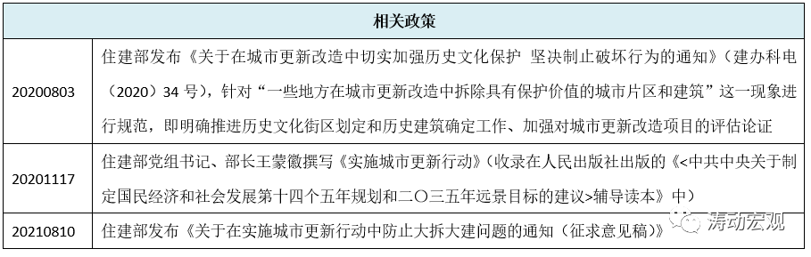 2021年8月10日,住建部發(fā)布《關(guān)于在實施城市更新行動中防止大拆大建問題的通知(征求意見稿)》,明確提出“不沿用過度房地產(chǎn)化的開發(fā)建設(shè)方式”,并將其與房地產(chǎn)調(diào)控結(jié)合在一起,意味著城市更新政策明顯收緊,這也是繼續(xù)7月30日政治局會議提出“糾正運動式‘減碳’,先立后破,堅持遏制‘兩高’項目盲目發(fā)展”后,又一個嘗試先規(guī)范、再進(jìn)行推動的領(lǐng)域。