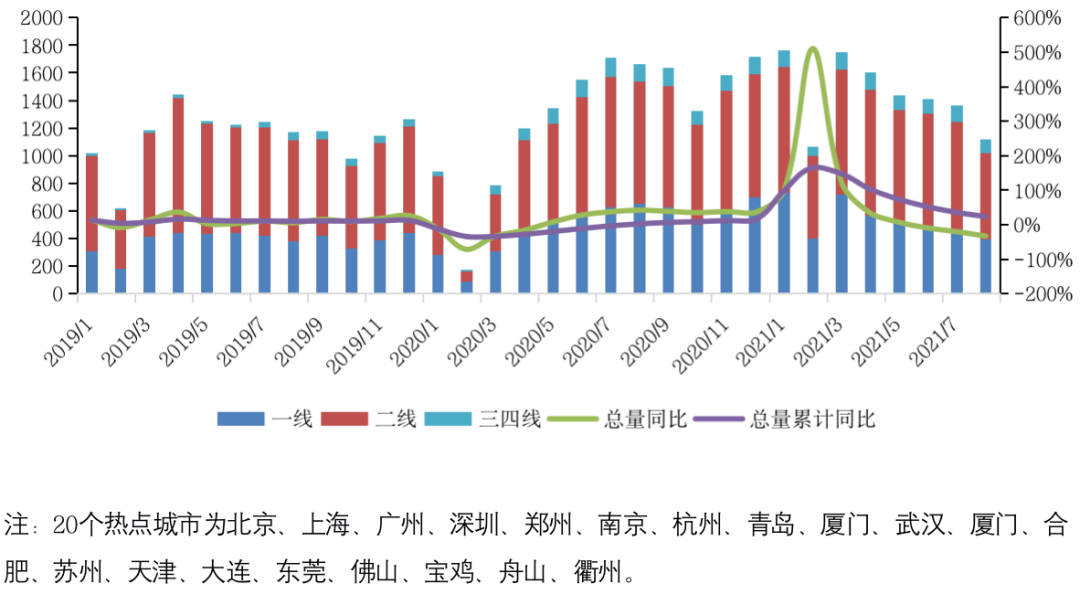 2021年三季度,全國新房成交由二季度“由穩(wěn)轉(zhuǎn)跌”趨勢進一步下行,至8月百城商品住宅成交規(guī)模連續(xù)4個月縮減,單月較2020年和2019年同期降幅擴大至22%和12%,連續(xù)6個月縮減。