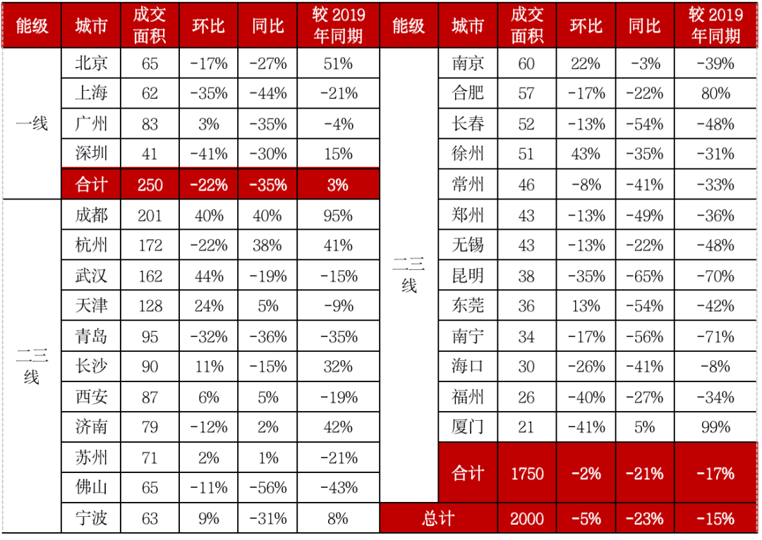 具體城市而言,重點城市保持較高市場熱度,廈門、成都、合肥、濟南、杭州和長沙成交面積較2019年同期上漲30%以上;武漢、西安、蘇州、南京規(guī)模環(huán)比再增。部分城市樓市下行壓力加大,如南寧、昆明、長春、福州等市場動能明顯轉(zhuǎn)弱,規(guī)模同環(huán)比及較2019年同期均有不同幅度下降。