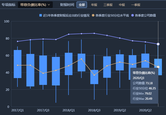 據(jù)年報,2020年第三季,公司合并報表資產(chǎn)負(fù)債率為70.05%。報告中稱,報告期內(nèi),公司資產(chǎn)負(fù)債率較高,負(fù)債規(guī)模較大。雖然較高的杠桿率加快了公司的業(yè)務(wù)發(fā)展速度,但如果公司流動性管理與負(fù)債情況不匹配,則在市場環(huán)境發(fā)生不利變化的情況下,公司面臨的財務(wù)風(fēng)險隨之提高。如下圖,紫光集團的歷年帶息負(fù)債比率遠高于同行。另外,三季報中,公司帶息債務(wù)總額占公司總負(fù)債的73.18%。報告中稱,公司有息負(fù)債在報告期內(nèi)有所回落,但規(guī)模仍較大,在總負(fù)債中占比較高。未來公司償債壓力較大,需要大量流動資金償還有息債務(wù)本息,如果公司經(jīng)營狀況出現(xiàn)下滑或者融資渠道減少的情況,可能導(dǎo)致債券償付受到不利影響。如下圖,紫光集團的歷年帶息負(fù)債比率遠高于同行。