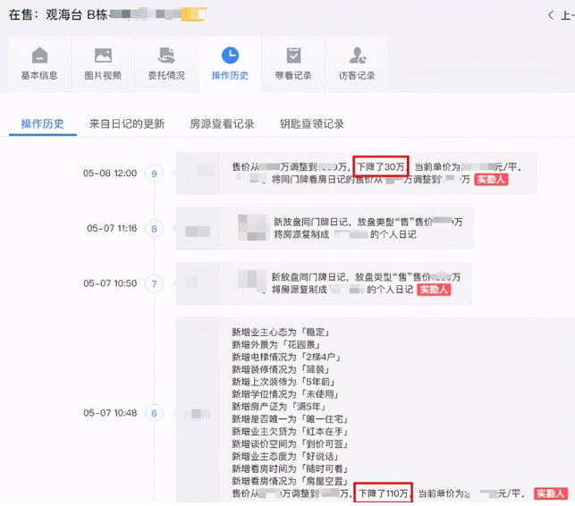 南山后海的觀海臺(tái),兩天內(nèi)報(bào)價(jià)下調(diào)140萬。5月7日下調(diào)110萬,5月8日業(yè)主再下調(diào)30萬。