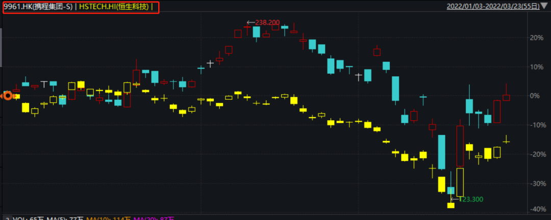 在整體股市表現(xiàn)不佳的背景下,截至2022年3月23日收盤,攜程集團(tuán)今年以來的股價上漲0.16%。同期,恒生科技指數(shù)、恒生指數(shù)分別下跌16.26%和5.32%。