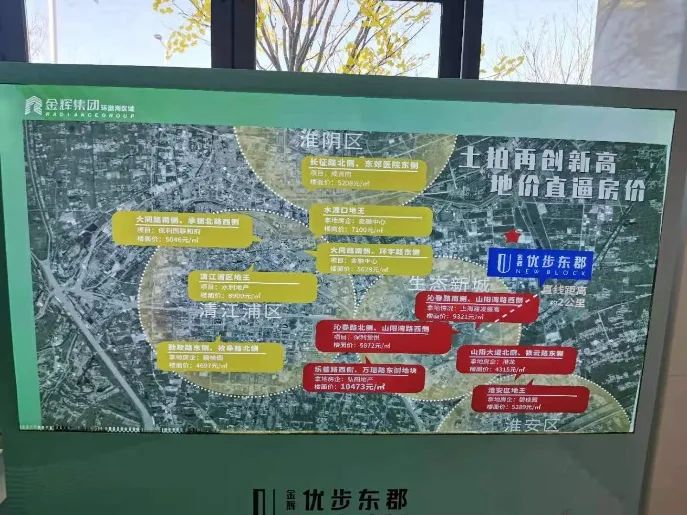 值得關注的是,蘇北部分城市在售樓盤也將周邊“地王”作為賣點,向客戶傳導房價上漲預期。譬如淮安的金輝優步東郡、宿遷的奧園譽湖書院都在售樓處打出了類似標識,房企“科普”地價驅動房價上漲預期,恐慌性購房現象在所難免。