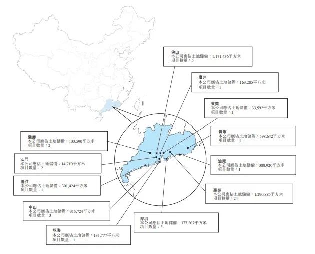 招股書介紹,主要在粵港澳大灣區(qū),截至8月末45個(gè)項(xiàng)目組合,覆蓋廣東省12個(gè)城市,其中4個(gè)項(xiàng)目通過(guò)一家聯(lián)營(yíng)公司開發(fā)。