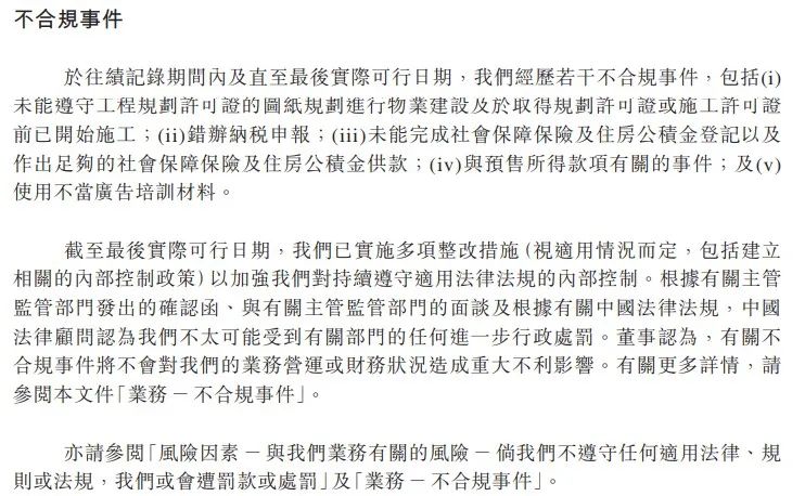 (i)未能遵守工程規(guī)劃許可證的圖紙規(guī)劃進(jìn)行物業(yè)建設(shè)及于取得規(guī)劃許可證或施工許可證前已開始施工; (ii)錯(cuò)辦納稅申報(bào); (iii)未能完成社會(huì)保障保險(xiǎn)及住房公積金登記以及作出足夠的社會(huì)保障保險(xiǎn)及住房公積金供款; (iv)與預(yù)售所得款項(xiàng)有關(guān)的事件; (v)使用不當(dāng)廣告培訓(xùn)材料。