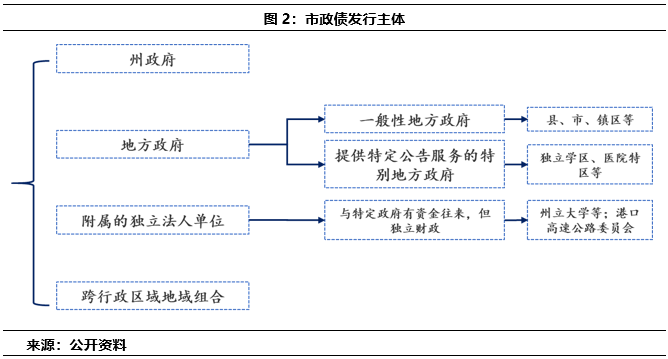 當(dāng)下而言,美國市政債的發(fā)行主體主要為州、地方政府或者前兩者的附屬單位,此外還可以為跨行政區(qū)域的地域組合,具體如圖2。此外,需要注意的一點是美國是邦聯(lián)制國家,雖然這些地方政府大小不一,但從制度來看,他們發(fā)行市政債券具有獨立自主權(quán),在不違反聯(lián)邦和州法律基礎(chǔ)上,不需要聯(lián)邦政府和上級州的批準(zhǔn)和同意,獨立發(fā)行亦獨立負責(zé)償還責(zé)任。