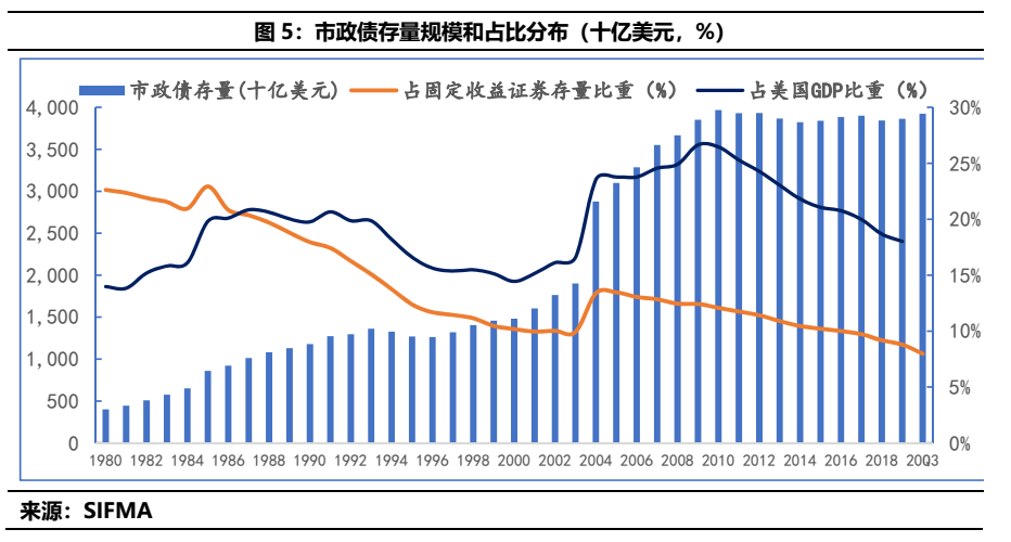 2)其次,我們介紹了當(dāng)下市政債的定義以及20世紀(jì)80年代以來美國市政債的規(guī)模和現(xiàn)狀分析:絕對規(guī)模的相對穩(wěn)定和相對規(guī)模漸漸下滑,似乎是去城市化和工業(yè)化到了一定進度上的體現(xiàn),但仍扮演者極為重要的角色。