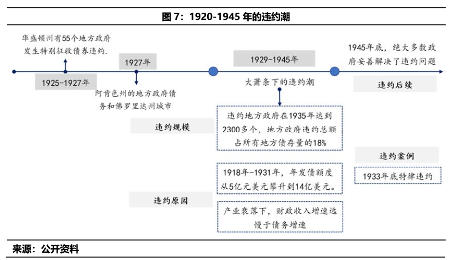 1920年-1945年的違約潮可以分為兩個階段,主要以大蕭條的爆發(fā)為節(jié)點(1929年),大蕭條之前的數(shù)年內(nèi),地方政府亦出現(xiàn)了一定的償付壓力,具體的案例方面,主要有: