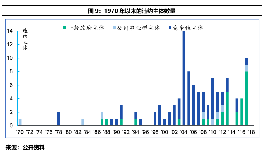 從違約主體的時間序列分布來看,1970年-2019年違約主體合計113家,其中一般政府主體29家,公用事業(yè)型主體8家,競爭性主體76家。20世紀(jì)80年代末和90年代初存在一波違約潮,但規(guī)模有限;但臨近進入21世紀(jì)開始,市政債違約主體的數(shù)量開始攀升,其中2004年與2017年分別是兩個峰值點。