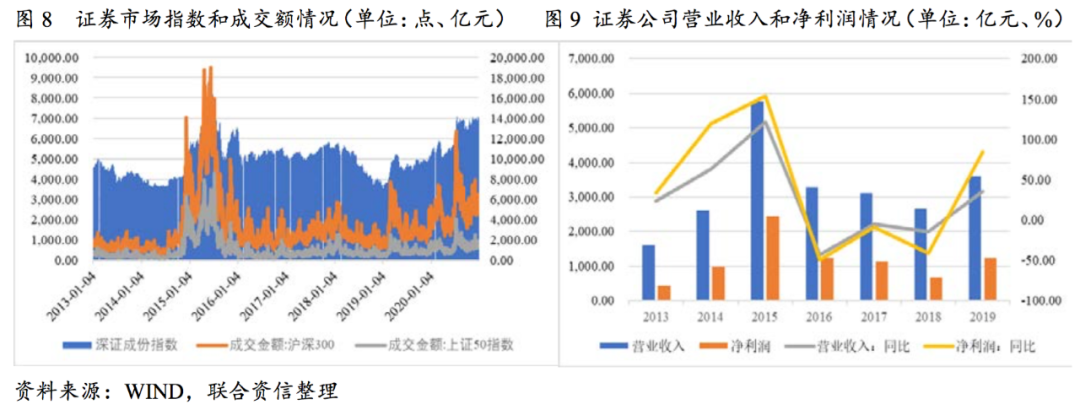 ?商業銀行與證券公司評級邏輯一致,部分打分卡指標有一定的差異性。商業銀行不良貸款率與宏觀經濟增速正相關,證券公司盈利水平與證券市場價格指數、成交額關系緊密。