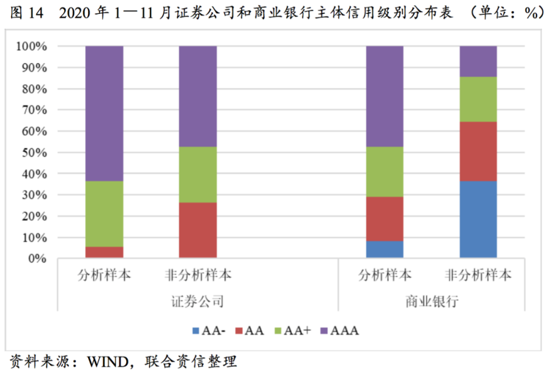 商業銀行信用級別分布較廣,證券公司高信用級別發債占比高于商業銀行。