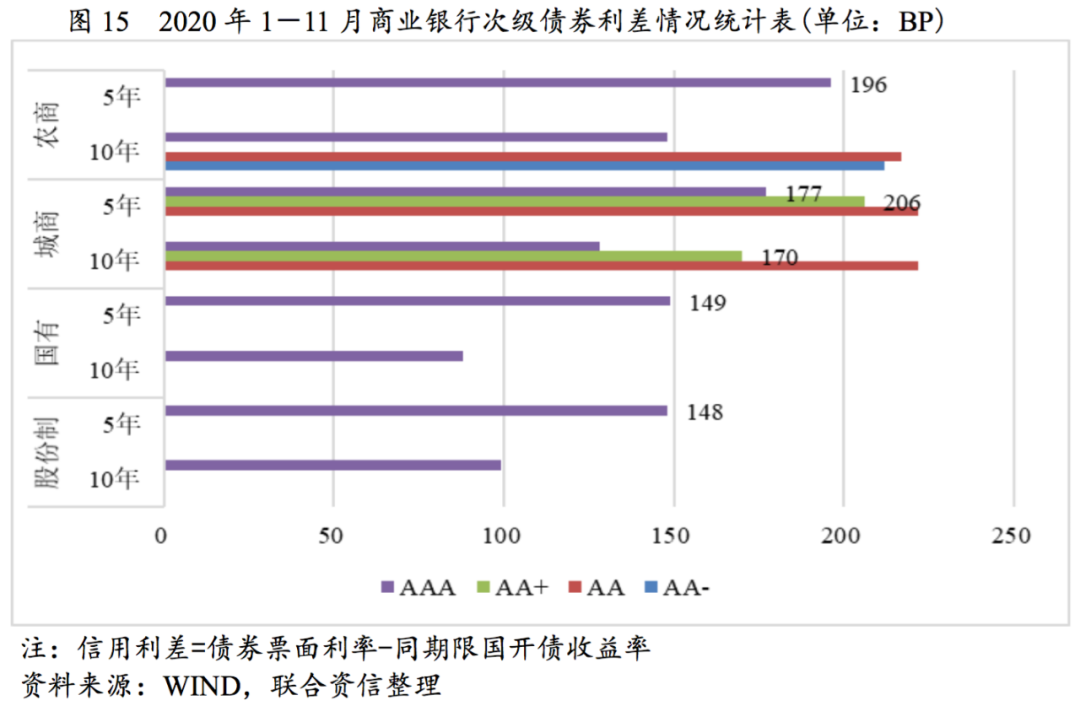2020年1-11月,證券公司次級債發行期限1~5年,1年期次級債均為主體信用級別AAA級證券公司發行。兩年期次級債券AAA級證券公司信用利差低于AA+級33BP,3年期次級債券AAA級信用利差低于AA+級別91BP。5年期AA-主體信用級別樣本較少,個體差異化影響較大。通過商業銀行和證券公司發行次級債券信用利差對比,國有商業銀行和股份制商業銀行信用利差最低,商業銀行信用級別之間的利差低于證券公司,但5年期AAA級證券公司次級債券信用利差低于AAA級城商行和農商行分別為8BP和28BP。