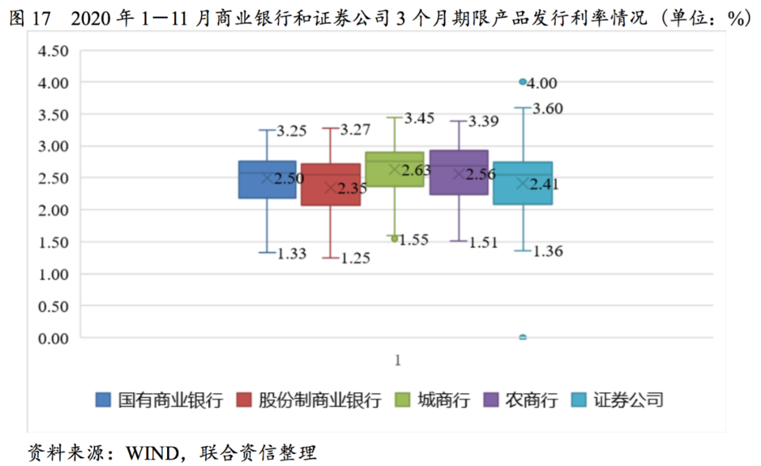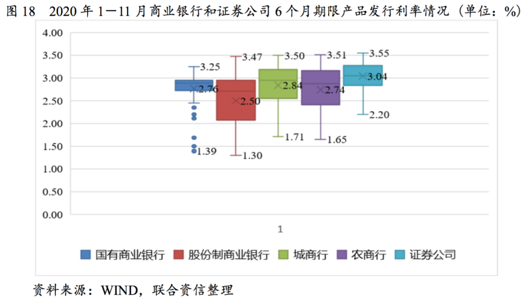 短期限產品中,股份制商業銀行利率均值最優,3個月期限產品證券公司發行利率均值優于國有銀行、城商行和農商行。6個月、9個月期限產品,證券公司與農商行和城商行發行利率均值差距較小。