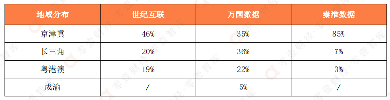 具體來(lái)看世紀(jì)互聯(lián)在京津冀地區(qū)的數(shù)據(jù)中心規(guī)模最大,在長(zhǎng)三角和粵港澳的規(guī)模差距不大;萬(wàn)國(guó)數(shù)據(jù)在京津冀、長(zhǎng)三角和粵港澳三大區(qū)域的資源布局相對(duì)均衡,除此之外,還在成渝地區(qū)進(jìn)行了布局;秦淮數(shù)據(jù)的數(shù)據(jù)中心布局則較為集中,其中85%的資源分布在京津冀地區(qū)。