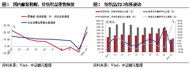 2021年以來國內服裝鞋帽、針紡織品類商品消費保持良好增長。2021年1-7月服裝鞋帽、針紡織品類商品銷售額7,672.50億元,同比增長28.76%,高于社會消費品零售總額增速8.06個百分點。同時消費市場呈現出網絡渠道銷售活躍、消費者彰顯個性需求顯著、直播電商帶來更好消費體驗等特點。