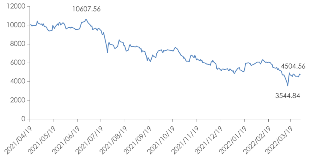 進入2022年,恒生物業服務及管理指數也一直呈現波動下滑態勢,并于2022年3月15日降至最低點3544.84點,相較最高點(2021年6月30日)10607.56點下降66.58%,至3月底,恒生物業服務及管理指數達4504.56點。