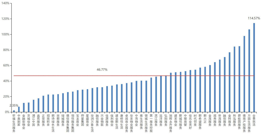 增值服務毛利率高于基礎物業服務毛利率,且社區增值服務的毛利率更高。其中,佳源服務基礎物業服務毛利率最高,達30.37%,濱江服務社區增值服務毛利率最高,為71.31%,建業新生活非業主增值服務毛利率最高,達49.64%。