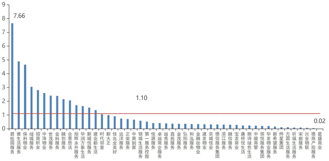 2021年披露年度在管面積的49家上市物企中,在管規模超過億平方米量級的物企達16家,超過均值(1.10億平方米)的物企為14家。其中,碧桂園服務在管面積達7.66億平方米,躍居上市物企在管規模之首;雅生活服務、保利物業和綠城服務在管面積均超過3億平方米;在管面積前五的企業規模總值達23.05億平方米,在上市物企中總規模占比超四成,上市物企的分化日益加大。