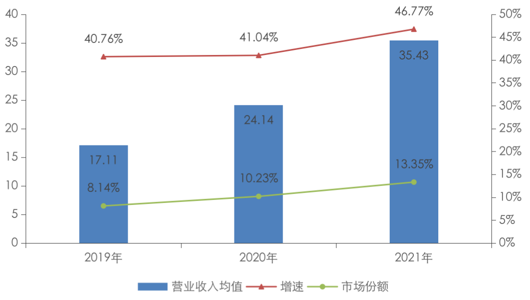 隨著物業管理規模的擴大和服務的多元化,物企經營業績持續高質量發展,多家物企表現亮眼,營業收入實現跨越式增長。50家上市物企營業收入總值由2019年的855.67億元增長至1771.28億元,均值由17.11億元增至35.43億元,復合增長率達43.88%。上市物企營業收入的市場集中度持續提升,2019年至2021年,50家上市物企在行業中的市場份額由8.14%增長至約13.35%。