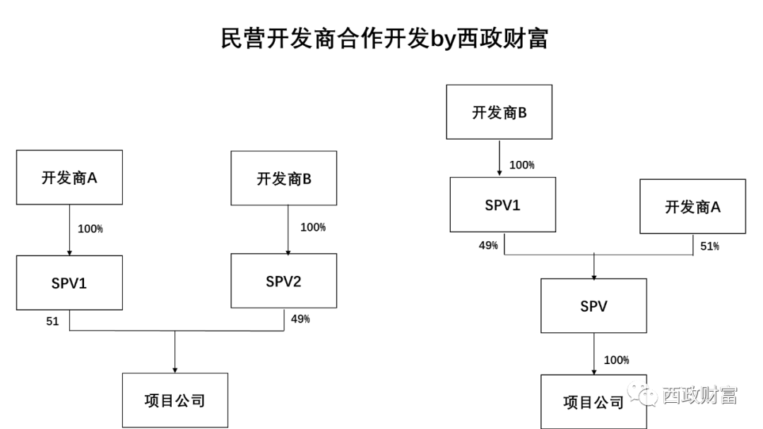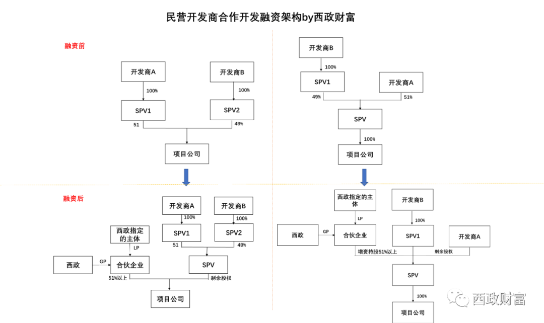 (1)西政(GP)與其指定的主體(LP)成立合伙企業,合伙企業取得項目公司51%以上的股權(左圖),或合伙企業通過增資方式持有SPV51%以上的股權(右圖),合伙企業與開發商約定對賭回購條件。