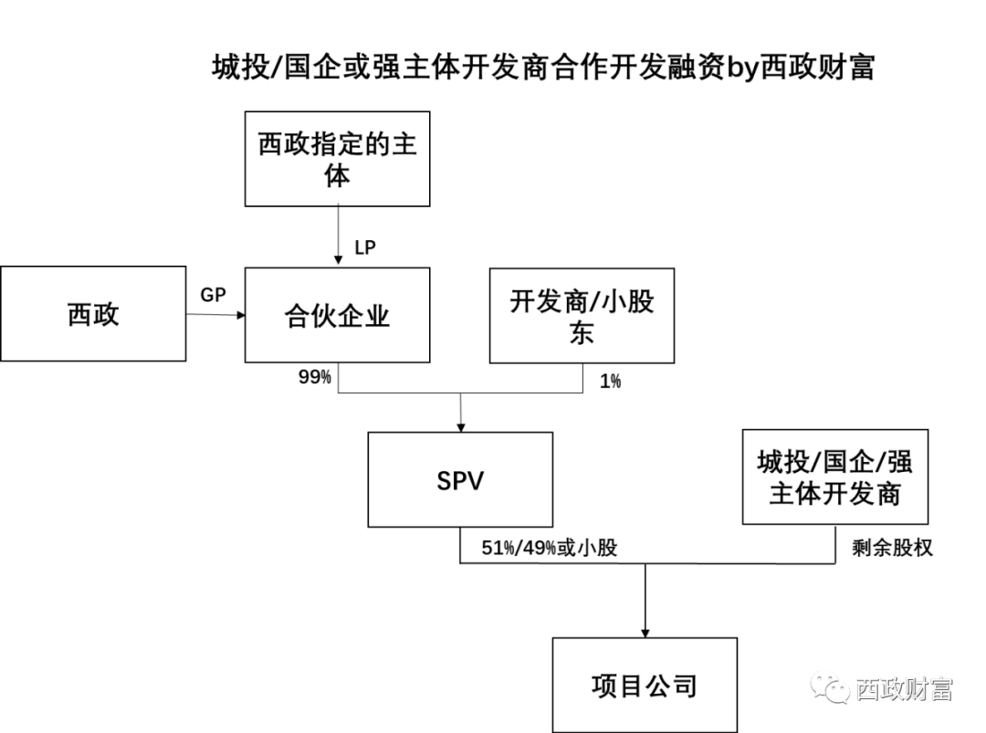 (1)西政(GP)與其指定的主體(LP)共同成立合伙企業,并取得SPV99%的股權,通過SPV實現對項目公司的投資。