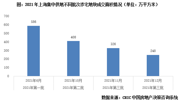 首先,供應(yīng)總量層面,2021年恰逢集中供地,疊加“十四五”元年,上海政府供地力度明顯加大,土拍市場(chǎng)持續(xù)放量,全年涉宅用地成交量突破1500萬(wàn)平方米。從供地節(jié)奏來(lái)看,共計(jì)三批次供地,第一批次6月和第三批次11-12月涉宅用地成交量分別達(dá)到586萬(wàn)平方米和574萬(wàn)平方米,迎來(lái)兩撥土拍成交高峰。
