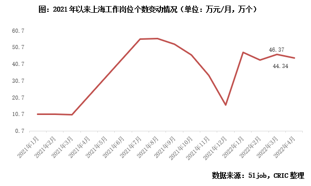 居民收入保持增長(zhǎng),但新增就業(yè)崗位減少:2022年一季度,上海市城鎮(zhèn)常住居民人均可支配收入23772元,增長(zhǎng)5.0%。但一季度上海市新增就業(yè)崗位19.26萬(wàn)個(gè),比去年同期減少2.62萬(wàn)個(gè)。從我們監(jiān)測(cè)的上海51job數(shù)據(jù)來(lái)看也可論證以上觀點(diǎn),工作崗位招聘量由3月的46.37萬(wàn)個(gè)降至4月的44.34萬(wàn)個(gè),工資水平保持小幅微增狀態(tài),4月平均工資為1.03萬(wàn)元.