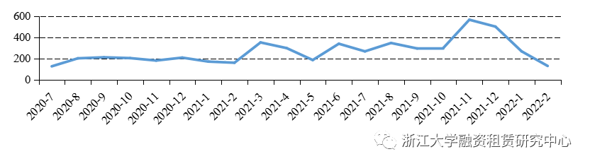 圖2融資租賃公司各月資產(chǎn)支持證券發(fā)行金額統(tǒng)計(jì)(億元)