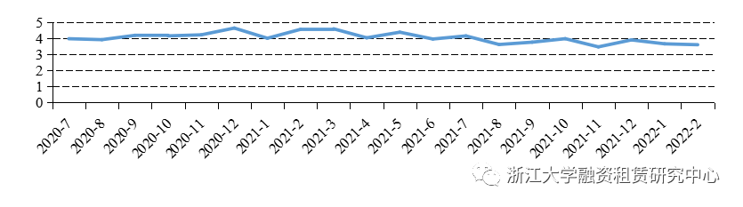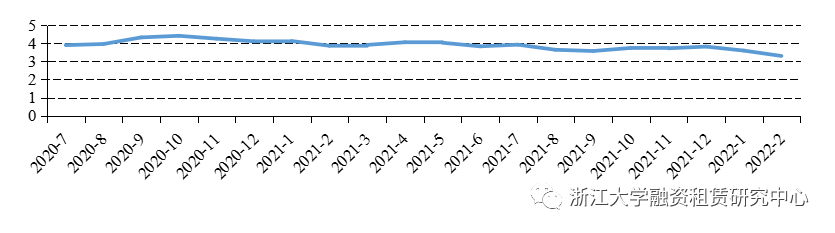 在發(fā)行利率方面,2022年2月融資租賃公司公司債平均發(fā)行利率為3.61%,環(huán)比下降6個(gè)BP,同比下降96個(gè)BP。其中中航國際租賃有限公司2022年面向?qū)I(yè)投資者公開發(fā)行公司債券(第二期)和平安國際融資租賃有限公司2022年公開發(fā)行公司債券(第三期)(品種一)票面利率最低,均為3.20%,發(fā)行期限分別為5年和4年;中飛租融資租賃有限公司2022年面向?qū)I(yè)投資者非公開發(fā)行公司債券(第一期)票面利率最高,為4.40%,發(fā)行期限為3年。