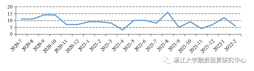 在發(fā)行數(shù)量方面,2022年2月共有10家融資租賃公司發(fā)行ABS/ABN,發(fā)行總數(shù)11支,較上月公司數(shù)量減少10家,發(fā)行數(shù)量減少19支;較去年同期發(fā)行數(shù)量增加3支。